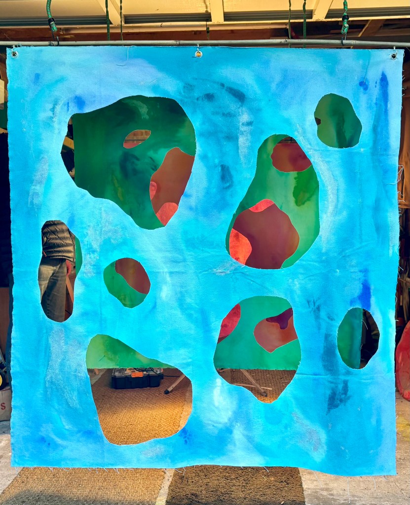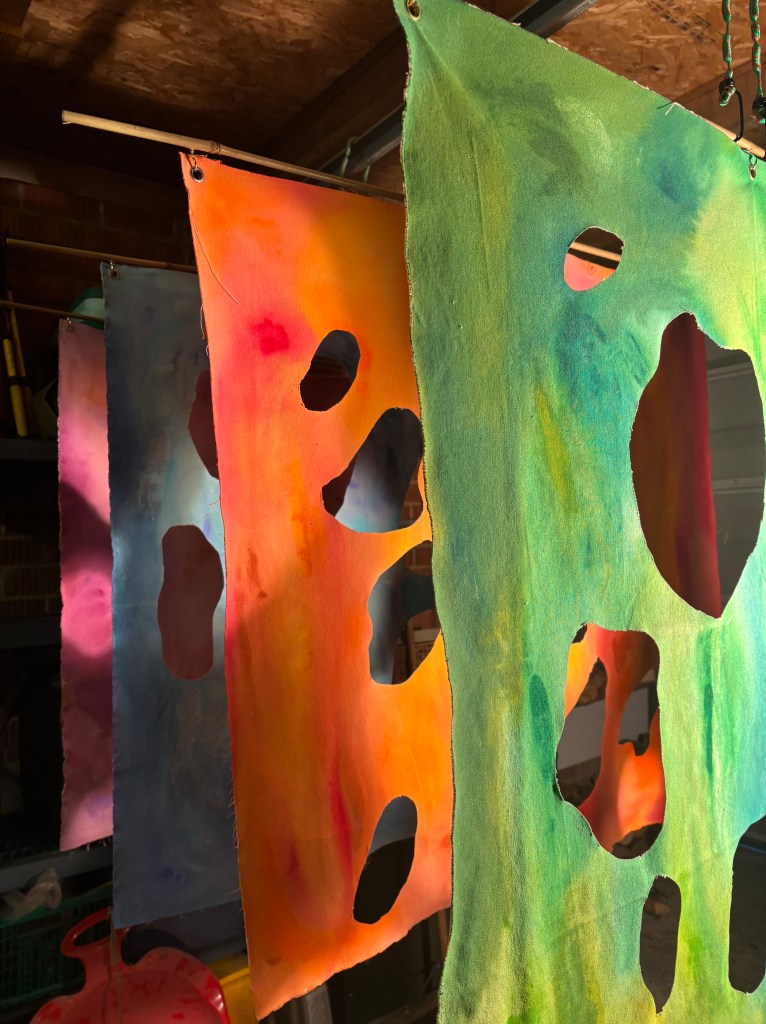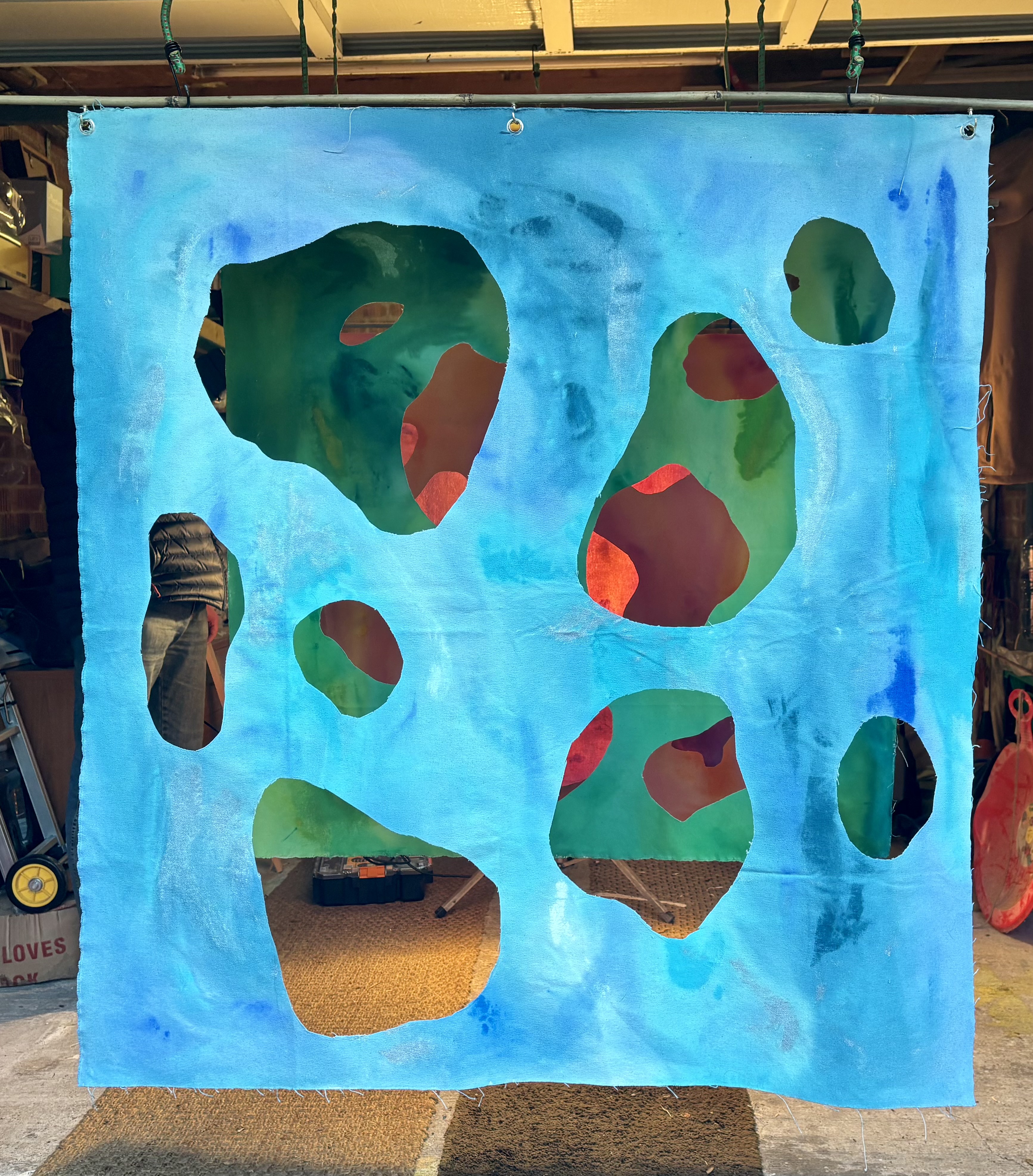 Canvas sheets, acrylic paint, hung with nails