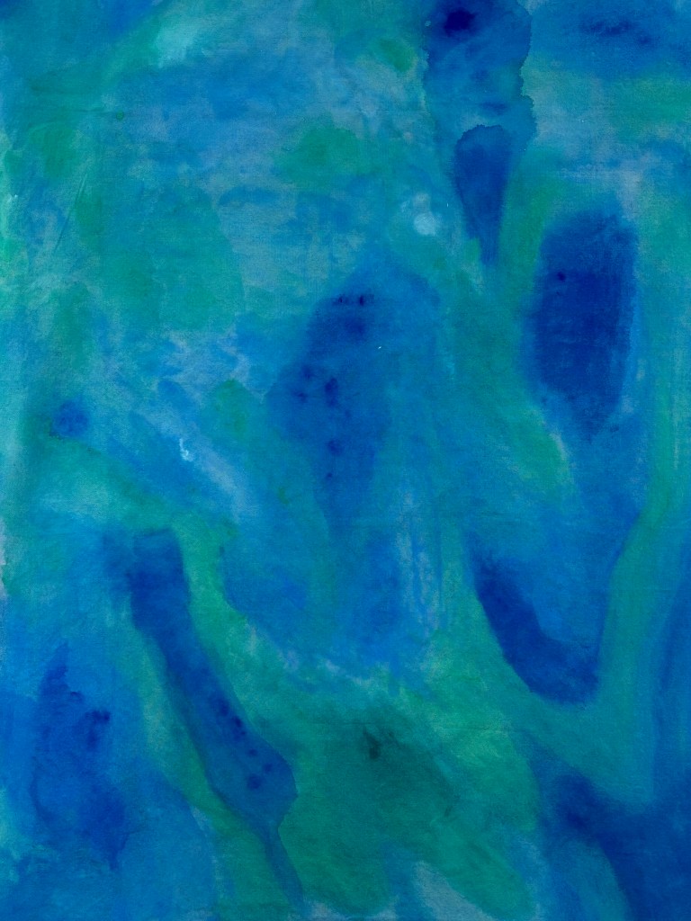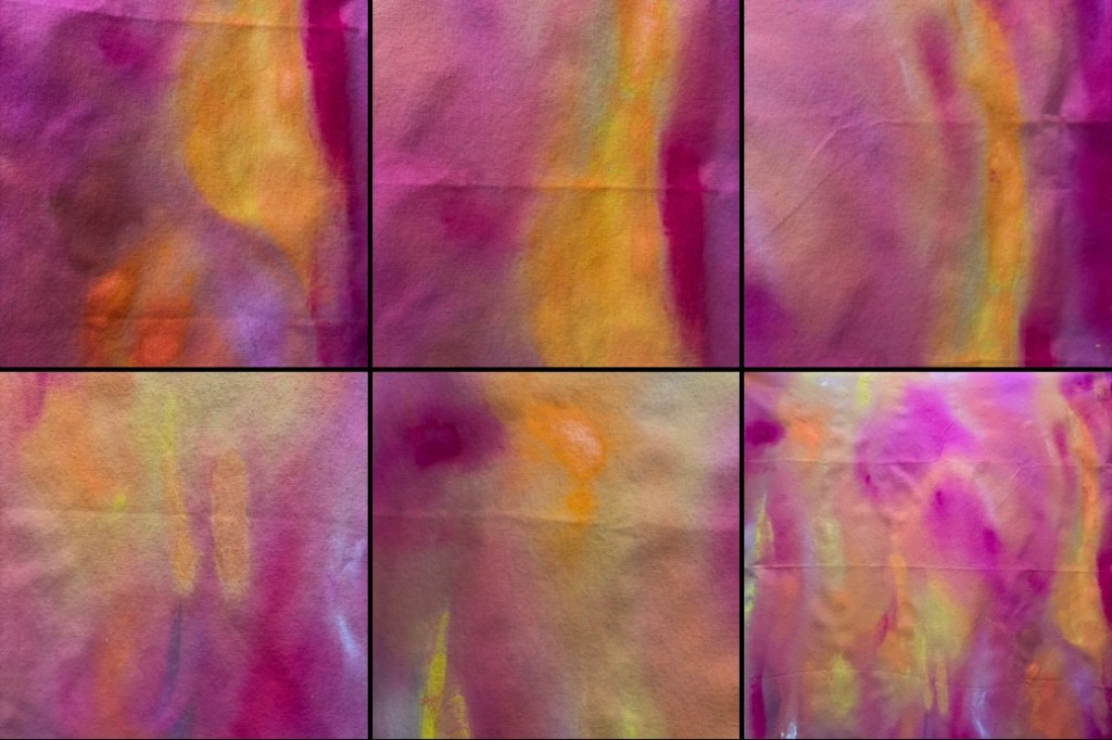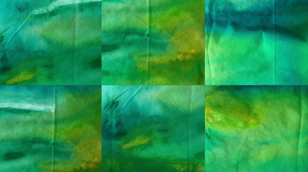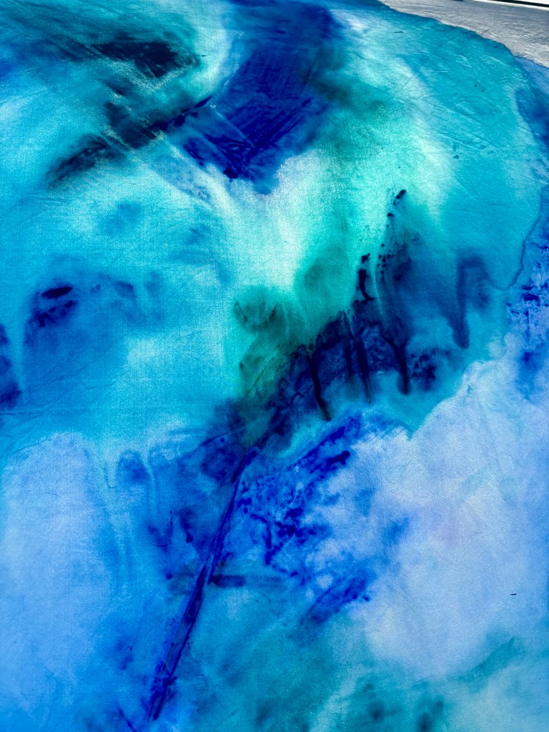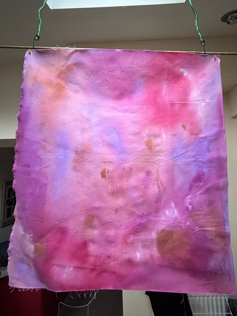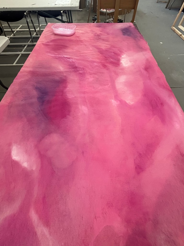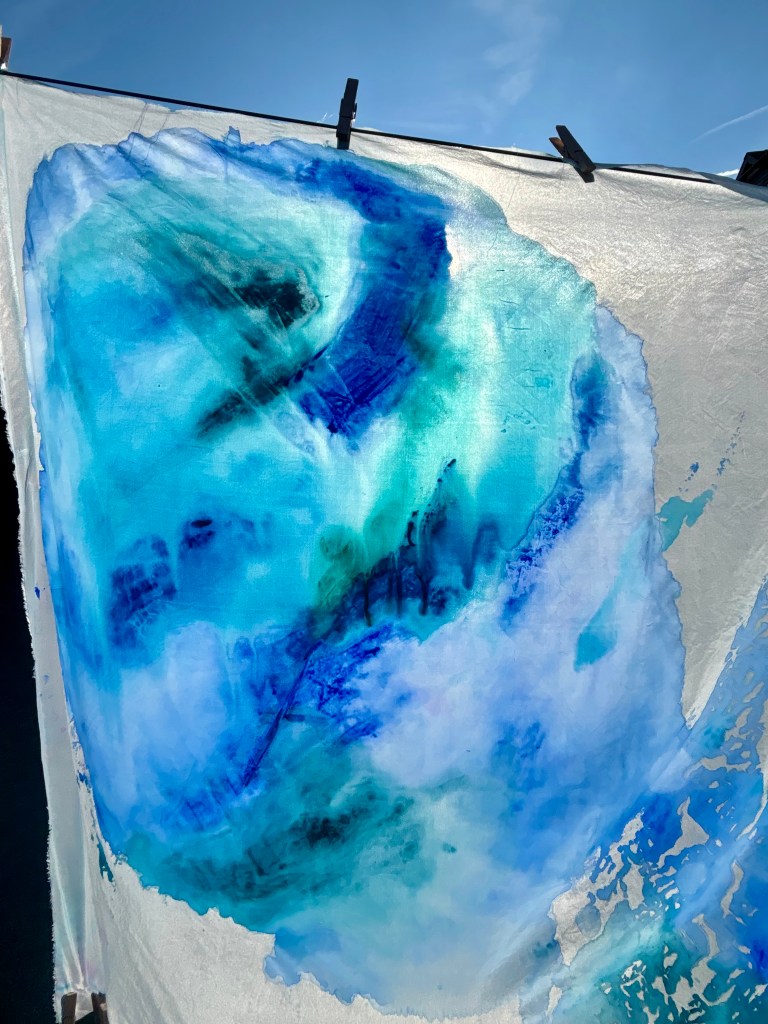 I add layers of thinned acrylic paint with water in layers, building the colour up on the sheet and adding texture as well.