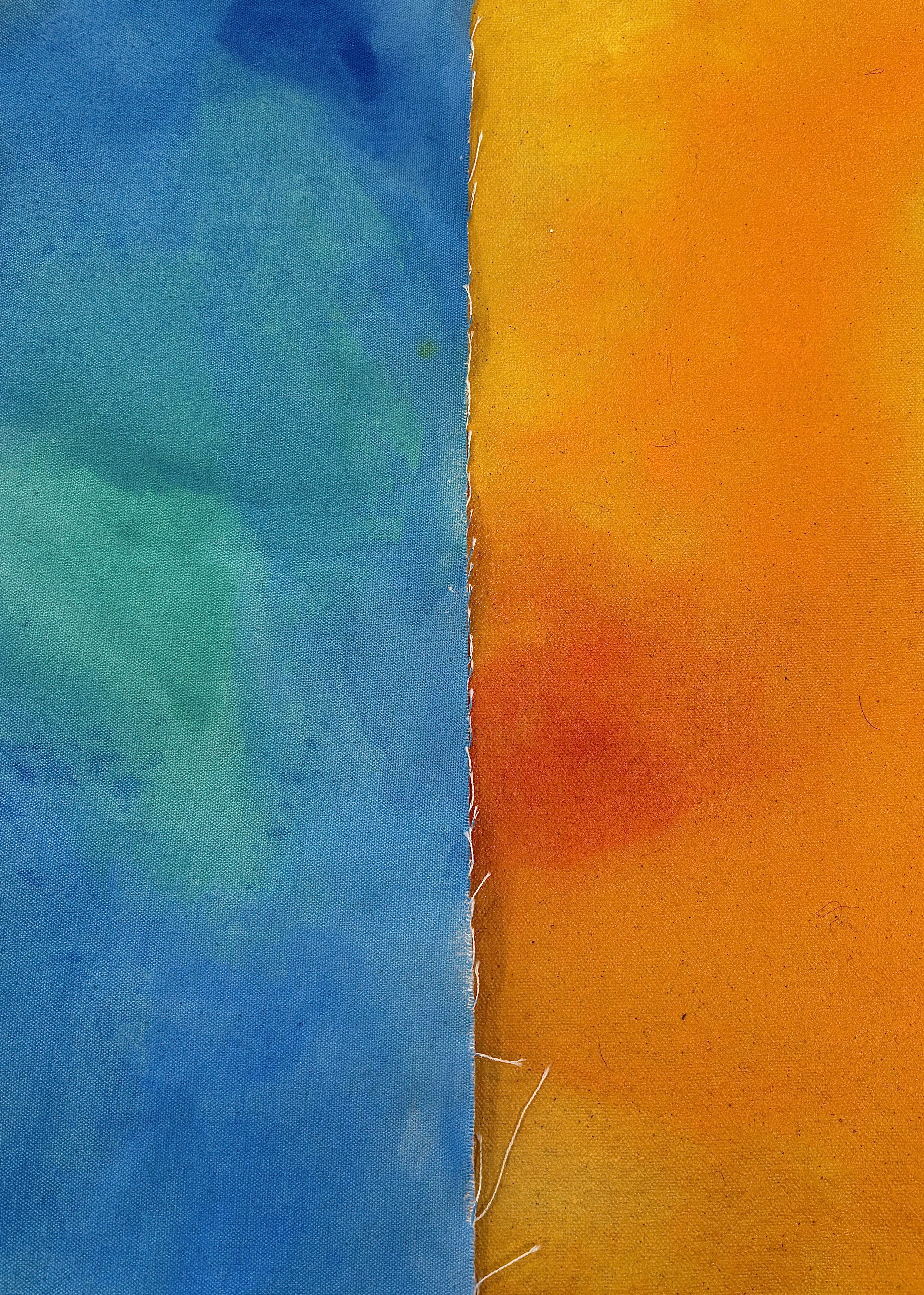 The blue colours contrasting against the orange coloured canvas sheet